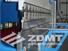 本系列液壓折彎機(jī)是雙缸上動式的數(shù)控液壓折彎機(jī),它通過伺服比例閥上的各類閥門動作來驅(qū)動左右油缸的伸長與返回,從而帶動滑塊的上升與下降?;瑝K的同步采用全閉環(huán)電液伺服控制技術(shù),滑塊位置信號由兩側(cè)光柵尺反饋給數(shù)控系統(tǒng),再由數(shù)控系統(tǒng)控制同步閥的開口大小,自動調(diào)節(jié)油缸進(jìn)油量的多少,從而控制滑塊(Y1、Y2)軸的同步運(yùn)行,始終保持對工作臺的平行狀態(tài)。