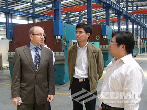 在整個的參觀過程里, EDWIN先生了解了我們先進的工廠全程監(jiān)控系統(tǒng),寬敞明亮的工作車間以及外形簡潔優(yōu)雅的產(chǎn)品。相信在韓總流暢的英文翻譯下,EDWIN先生一行對本地區(qū)剪折行業(yè)的發(fā)展?jié)摿σ欢ㄓ辛诵碌恼J識。同時,我們很感謝韓總和EDWIN先生,他們站在一個全新的角度,對中德機床提出了建設(shè)性的建議。我們也希望中德機床精益求精,同ESTUN公司和DELEM產(chǎn)品建立更緊密的關(guān)系,將中德機床推向更廣闊的市場。